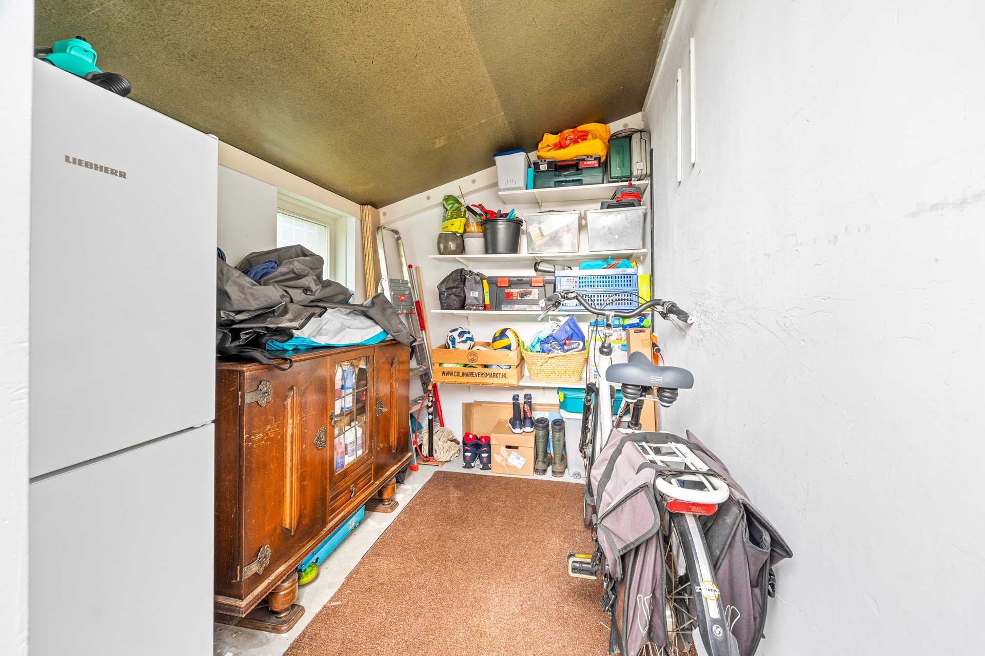 At the front of the house, there is a brick shed for bicycles and garden tools. Parking is available in the street.