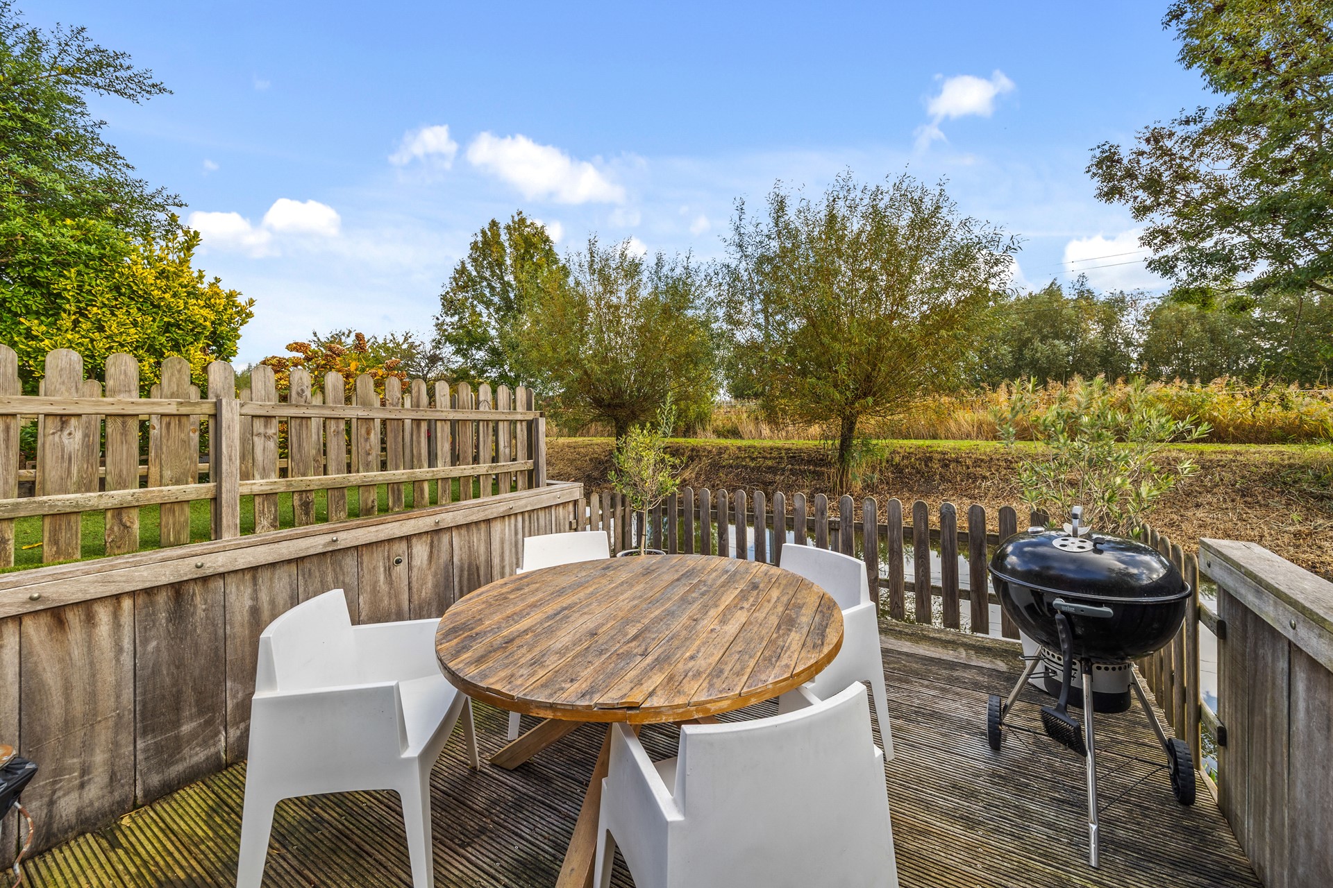 Back on the ground floor, it’s time to admire the highlight of this home: the backyard. It consists of a tiled terrace adjacent to the house, a (synthetic) grass strip, and a lowered deck terrace right by the water. There are plenty of options for creating multiple seating areas and enjoying a year-round holiday atmosphere. Birds, fish, and open views—simply wonderful!