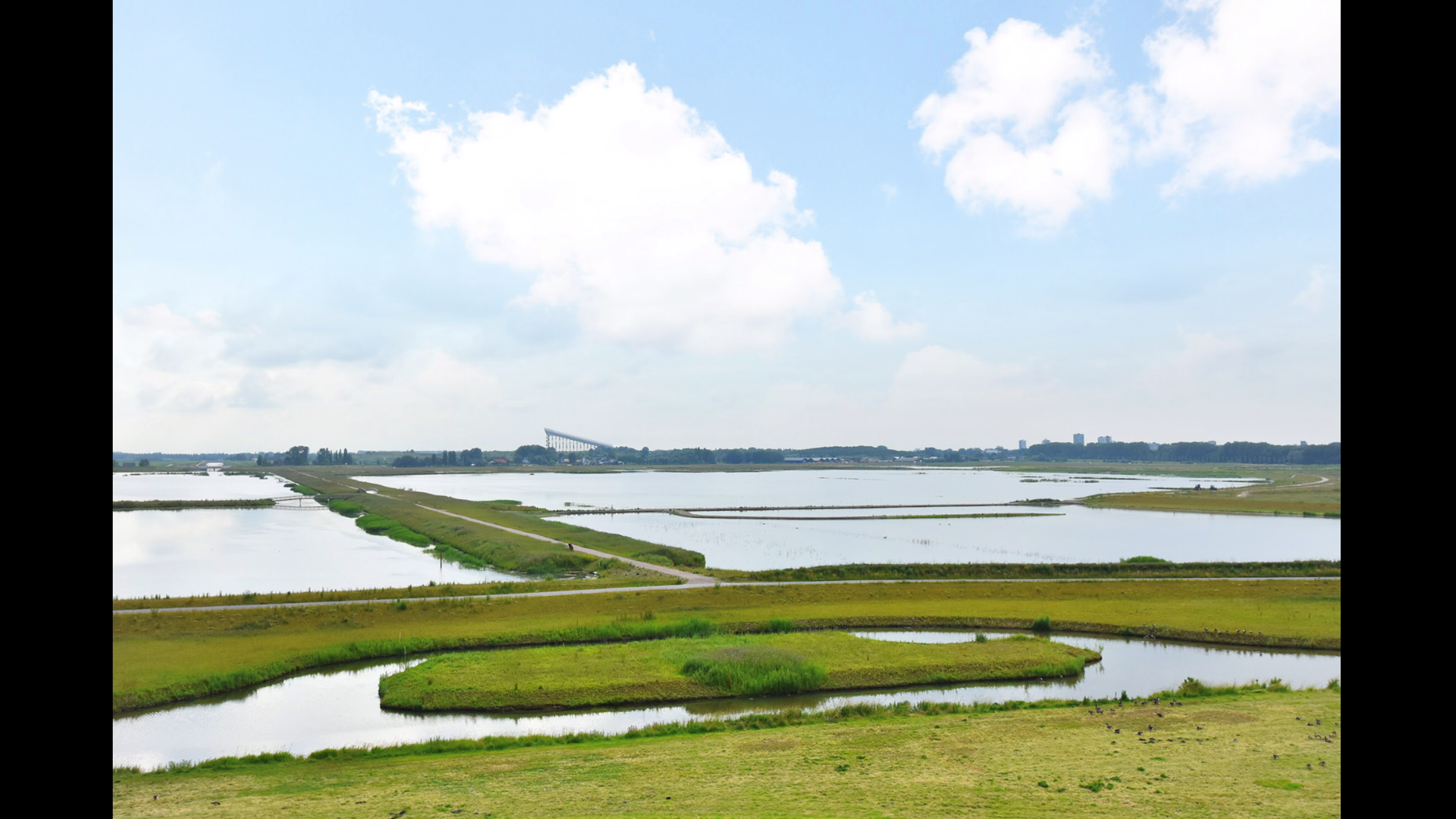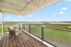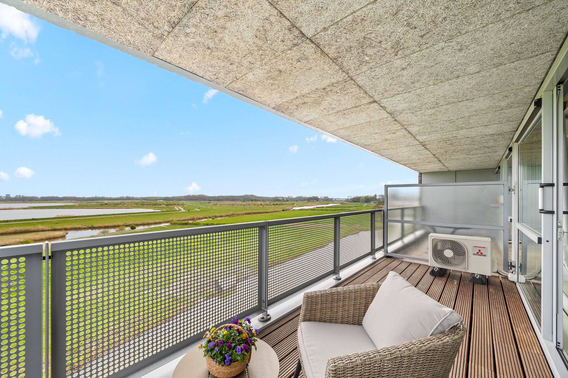 Via de glazen schuifpui stapt u het brede, overdekte terras op. Een plek waar u uren kunt zitten zonder dat de tijd zich opdringt. Het spel van water, wolken, groene velden en honderden watervogels vormt een levend schilderij dat elk seizoen verandert.