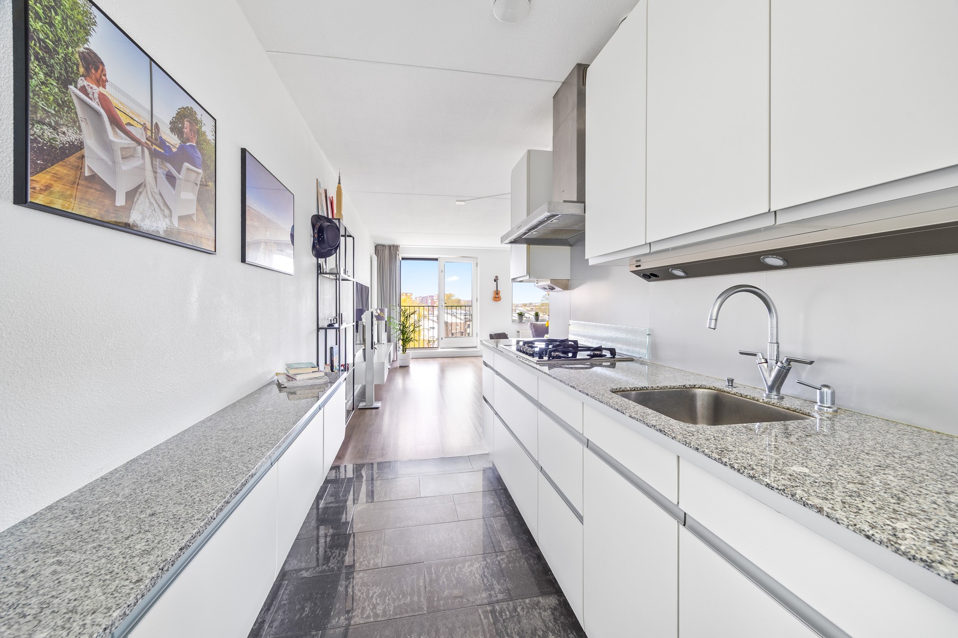 De open trap brengt u naar de woonlaag. Zodra u beneden komt, opent de woonkamer zich: licht, vriendelijk en met openslaande deuren naar het Franse balkon. Hier valt de middagzon naar binnen en zorgt de elektrische zonwering voor aangename verkoeling.