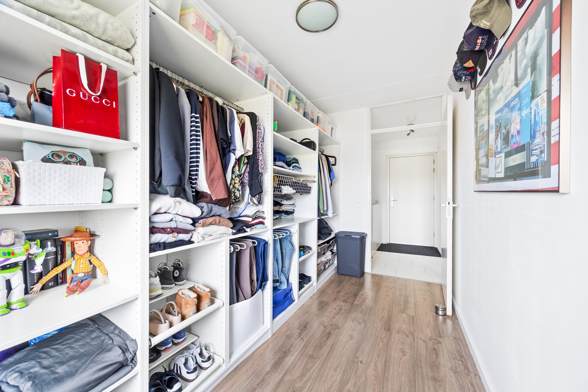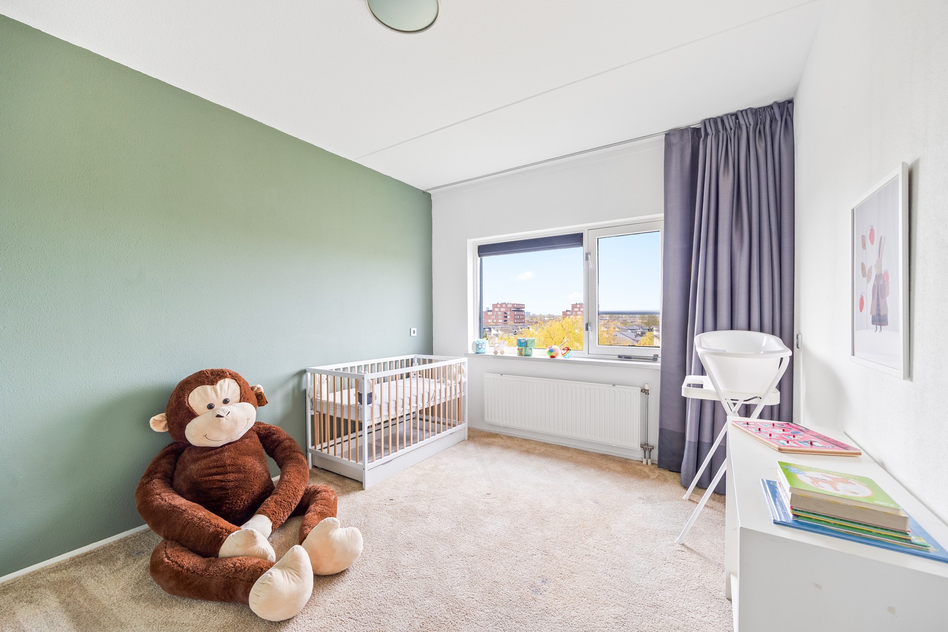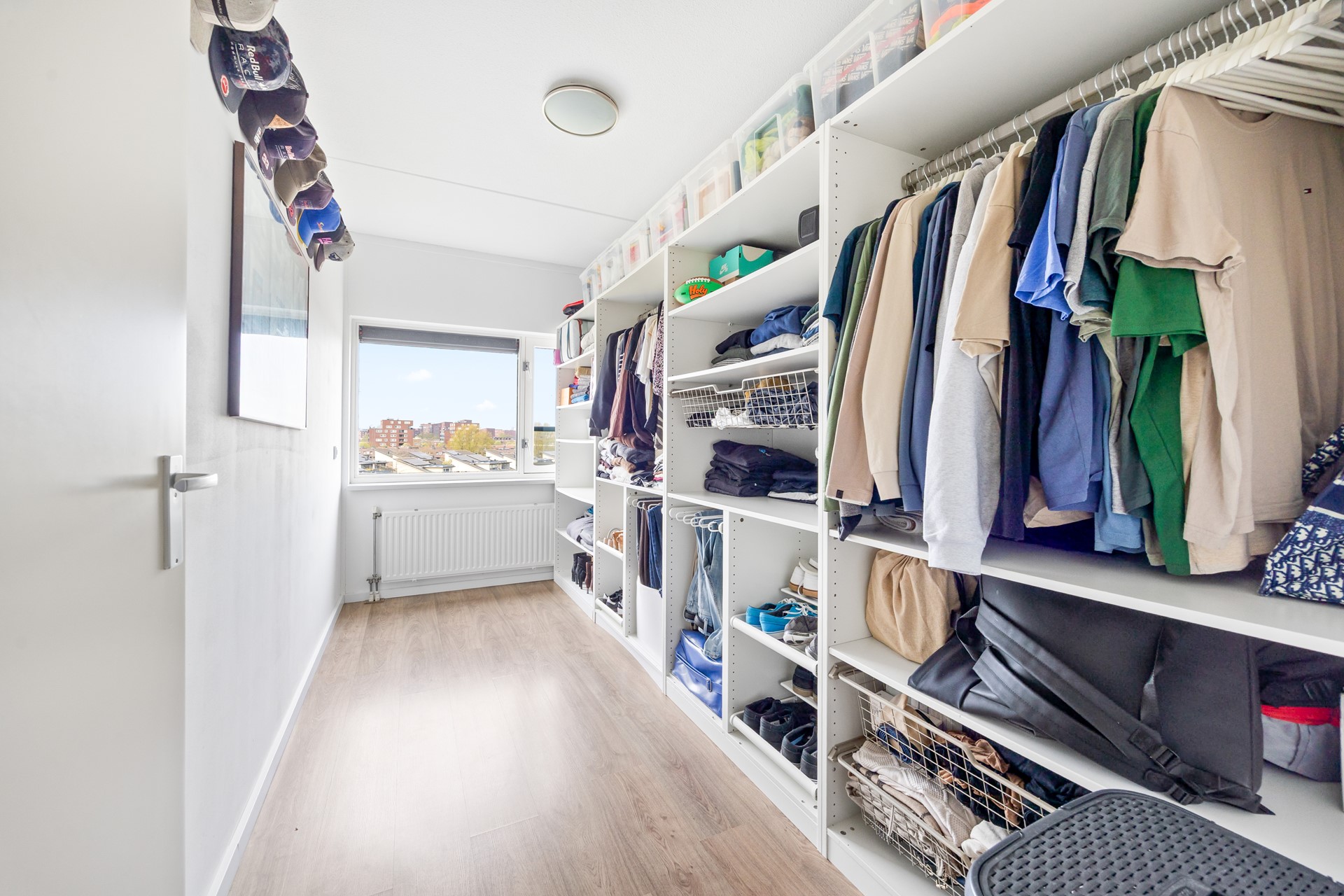 Voor u liggen twee slaapkamers, elk met ramen die de mooie wijk en het landschap als vanzelf naar binnen halen. De ene kamer is nu ingericht als walk in closet, de andere als slaapkamer — maar beide delen dezelfde kwaliteit: een horizon die nooit verveelt. De vloeren zijn afgewerkt met respectievelijk laminaat en tapijt, de ramen voorzien van horren.