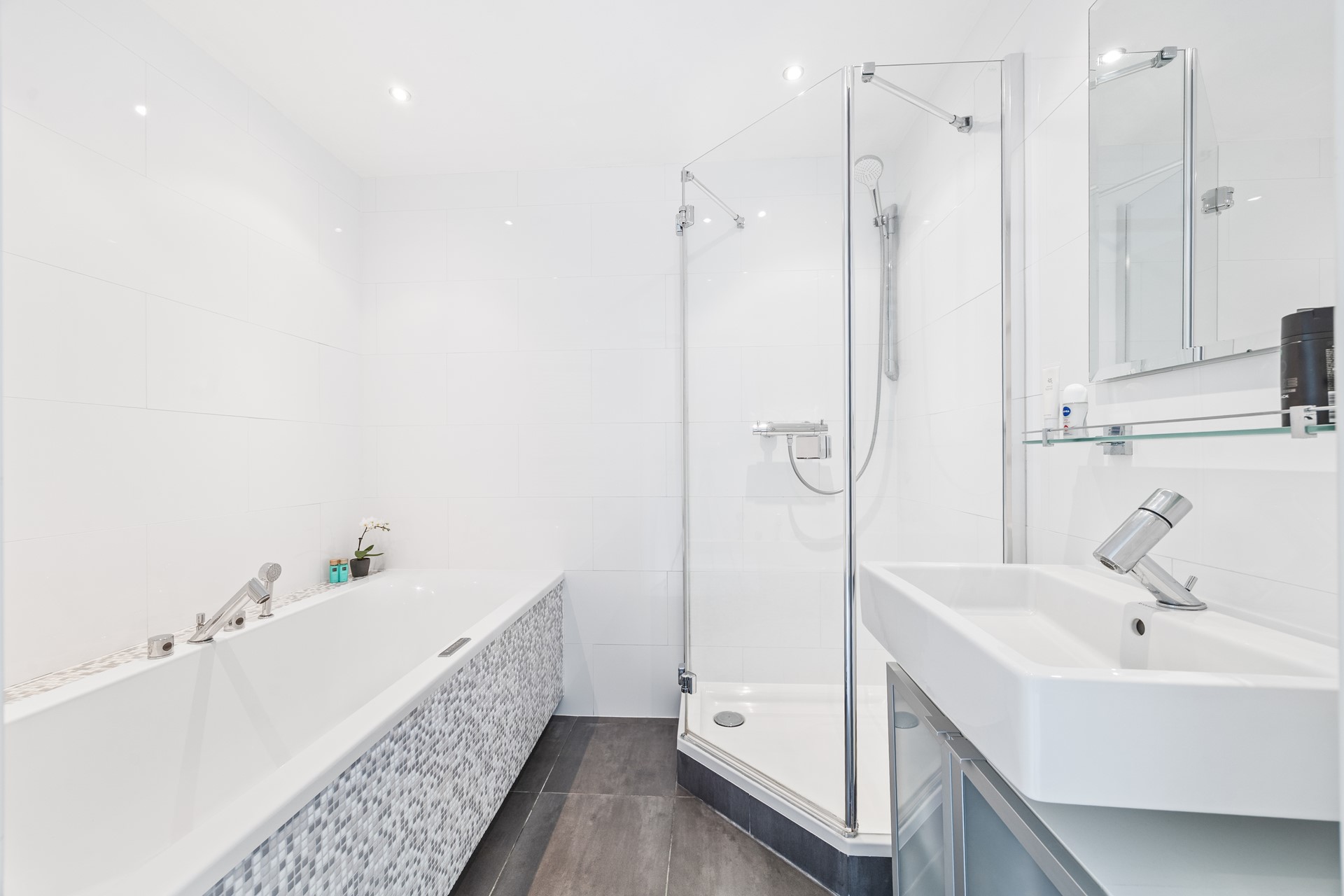 • Badkamer met ligbad, instapdouche, wastafel met spiegel