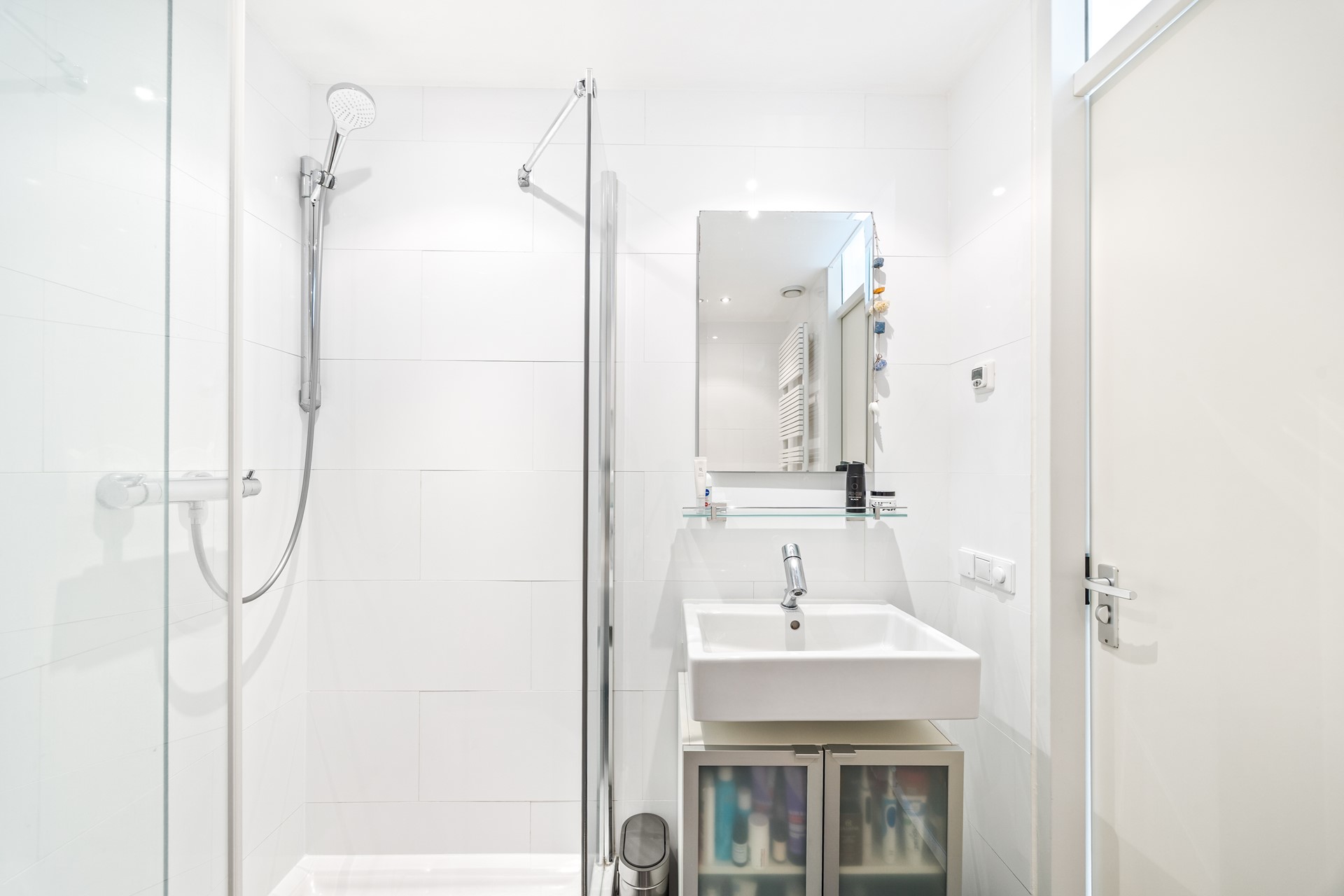 Via de beveiligde hoofdentree en de lift bereikt u de vijfde verdieping. De voordeur opent naar een verrassende indeling: u komt binnen op de slaapverdieping. Een rustige, lichte verdieping waar u de dag ontspannen begint en afsluit.
