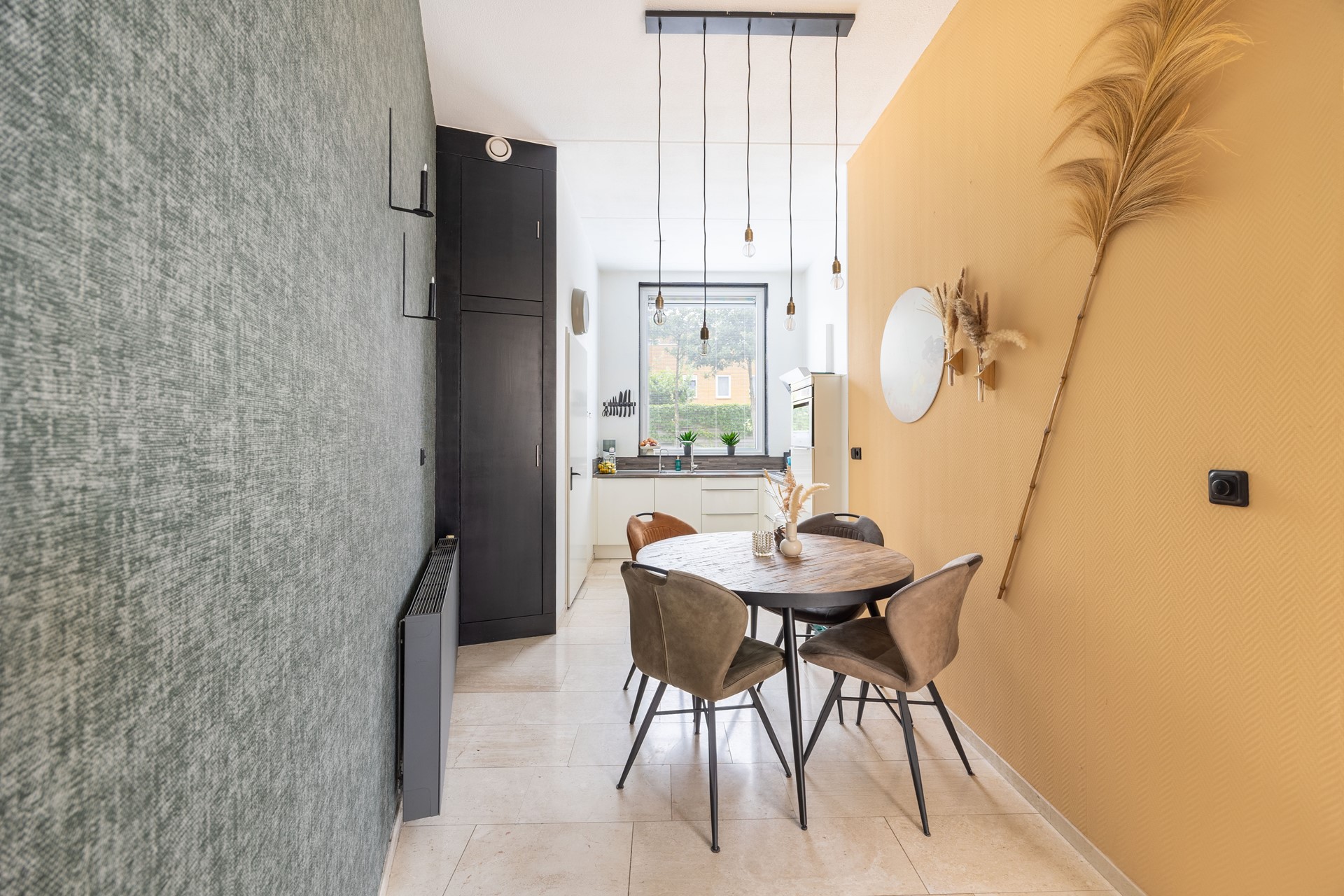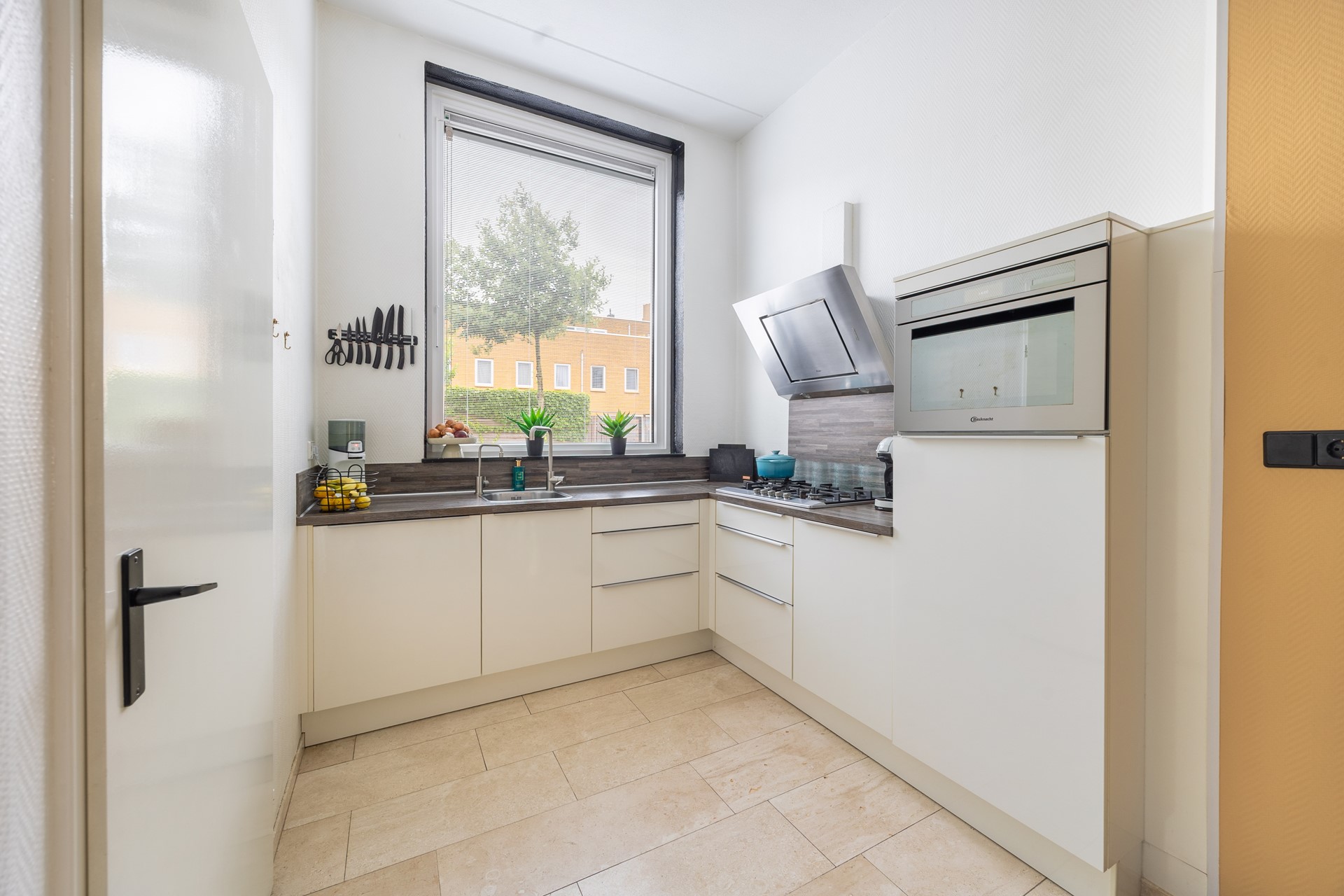 Nadat u de eethoek bent gepasseerd, komt u in de keuken. Die is compact en geplaatst in een hoekopstelling, waardoor u optimale bewegingsruimte houdt. U beschikt hier over een 5-pits gasfornuis en diverse vernieuwde inbouwapparatuur. Vanuit het grote raam kijkt u uit op de straat aan de voorzijde van het huis. Heeft u de deur aan de linkerkant ook gezien? Die leidt naar een zeer handige ruimte die functioneert als berg- en voorraadkast én plek voor de witgoedopstelling.
