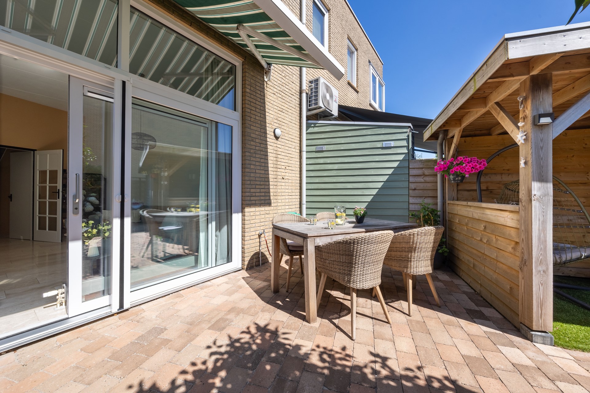 Tegen de achtergevel aan hangt de zonwering die niet alleen buiten zorgt voor schaduw, maar ook voor extra verkoeling in het huis. De houten veranda is een heerlijke plek om te zitten als de zon net wat te fel schijnt, of juist als het miezert.