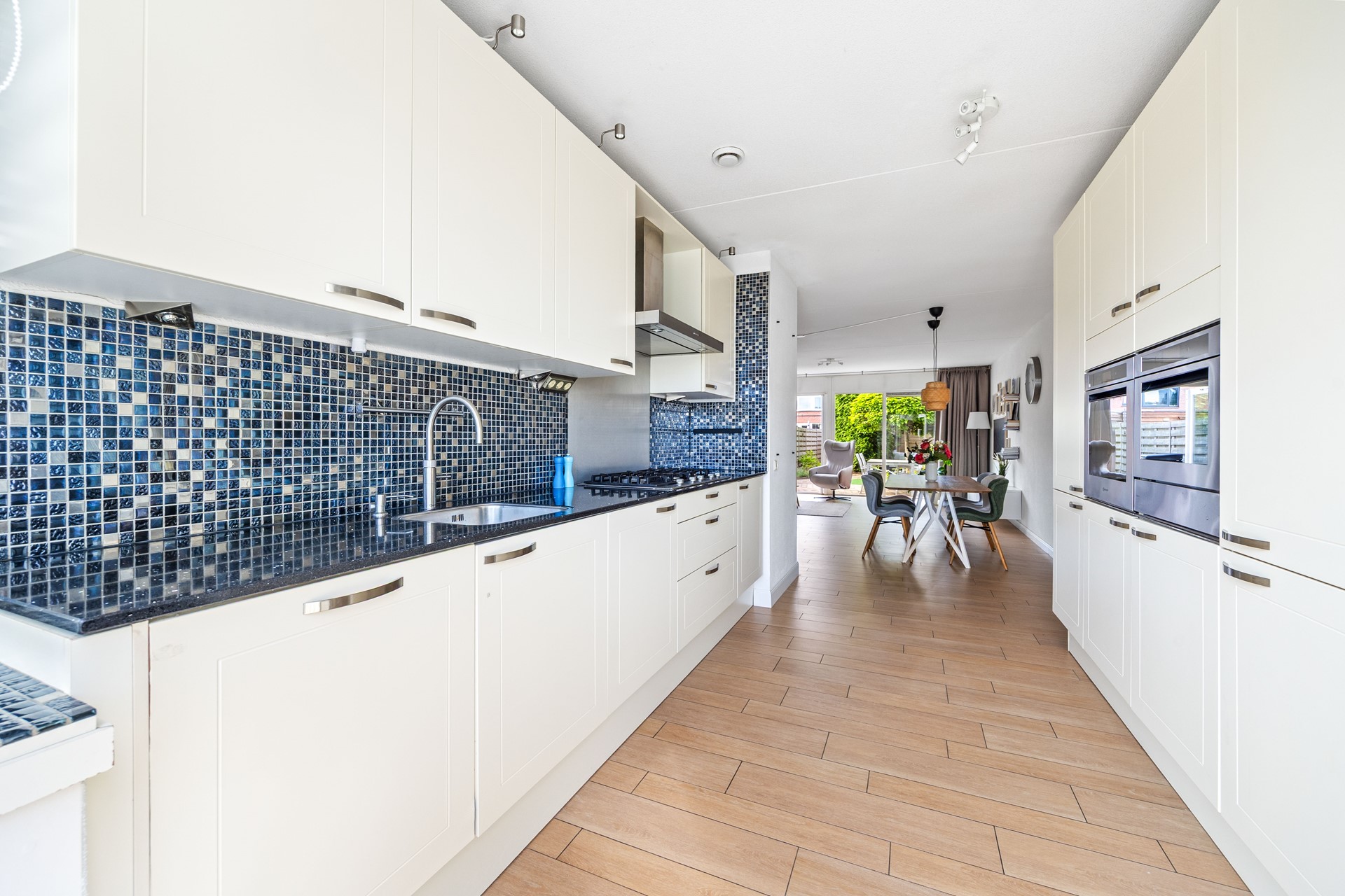 Aan de andere kant is de open keuken. Die is uitgevoerd in een combinatie van lichte tinten voor de kasten en laden, een stijlvol granieten werkblad en daarboven een strook mozaïektegels. U beschikt hier over een 5-pits gasfornuis, veel werk- en bergruimte en diverse inbouwapparatuur. Opvallend zijn de openslaande deuren die zorgen voor verbinding met buiten: de rietkraag en het water aan de overkant.