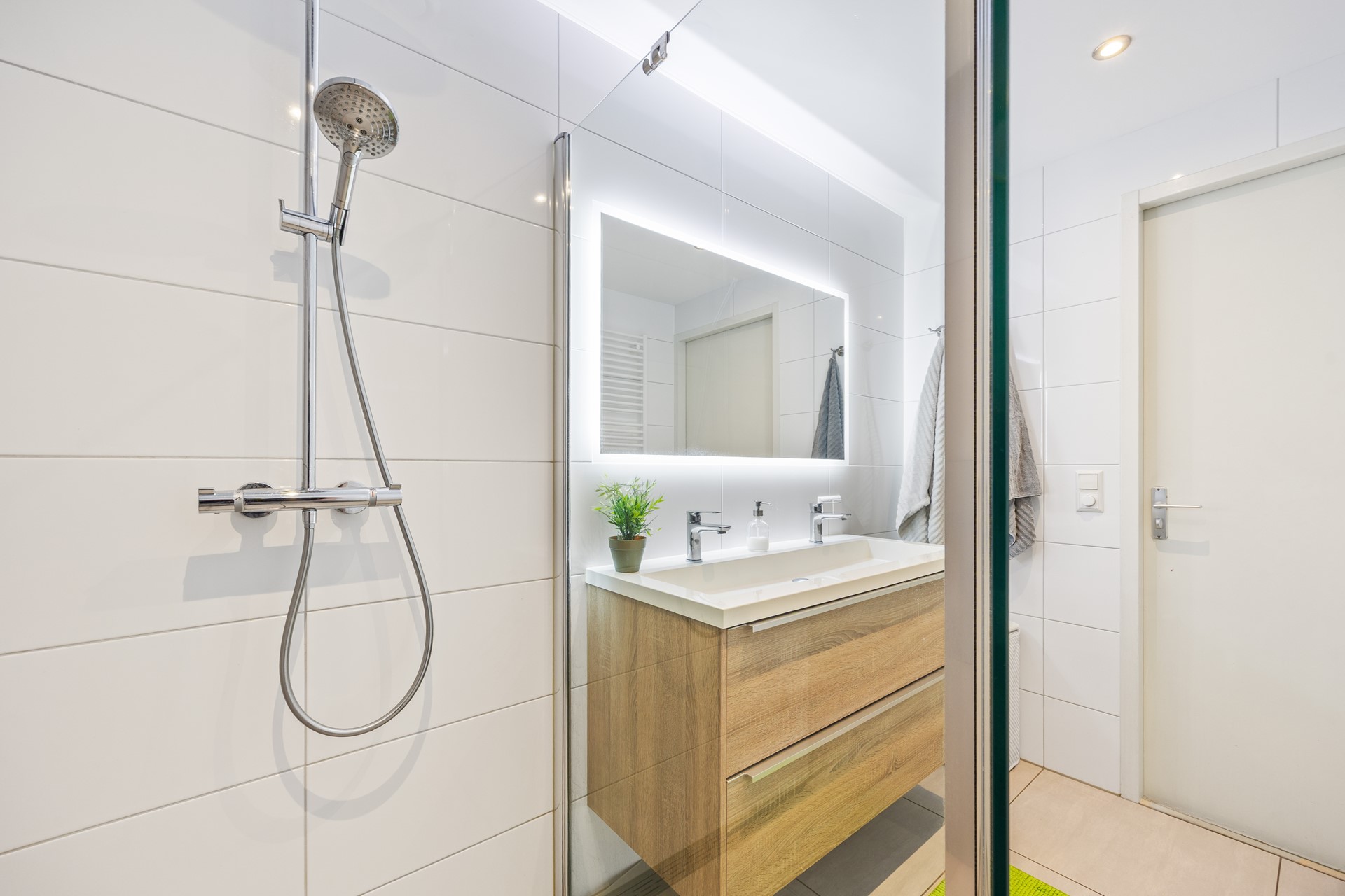 De badkamer is uitgevoerd met grote tegels op de vloer en de wanden, en voorzien van een dubbel wastafelmeubel met grote verlichte spiegel, en een heerlijk ruime instapdouche met rain shower. Het tweede toilet vindt u hiertegenover, in een aparte ruimte. Naast het toilet is nog een extra berging waar ook de CV ketel hangt.