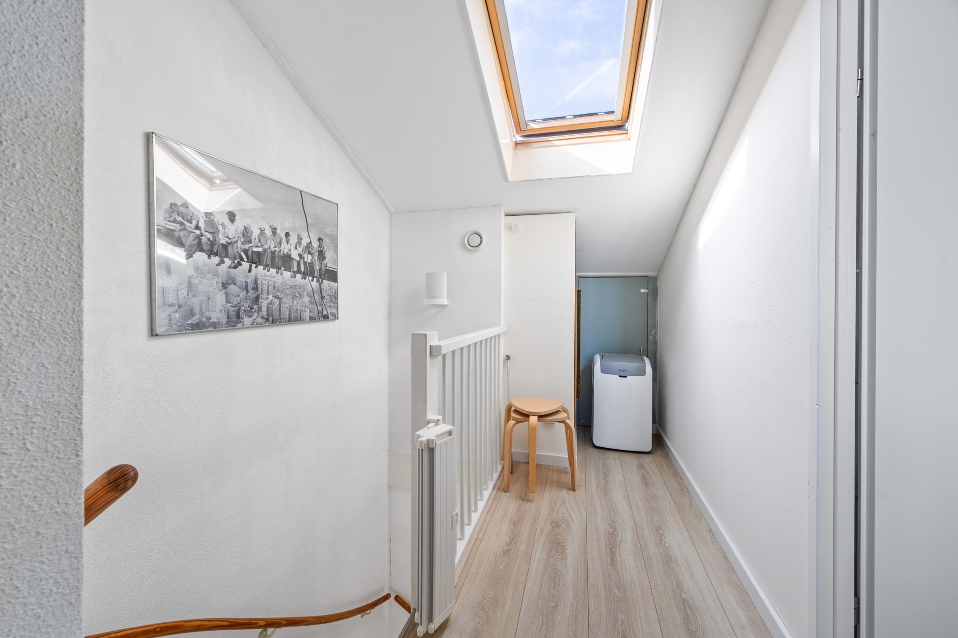 Via de trap in de hal bereikt u de eerste verdieping waar u beschikt over drie lichte slaapkamers. Twee ervan zijn gelegen aan de achterzijde van de woning. Ze beschikken over een breed raam en een extra dakraam in het schuine vlak. Slaapkamer drie bevindt zich aan de voorzijde. Hier zijn alle wanden recht en is er eveneens veel lichtinval. Naast deze slaapkamer is een (onopvallende)walk-in closet gecreëerd, bereikbaar via de overloop die net als de slaapkamers bekleed is met laminaat.